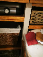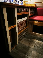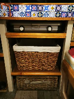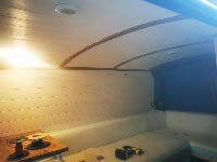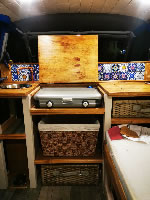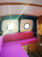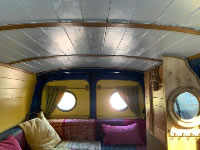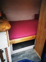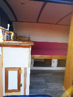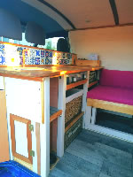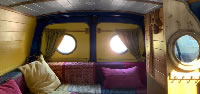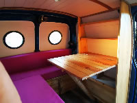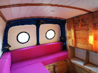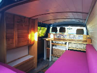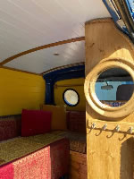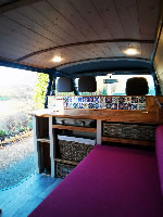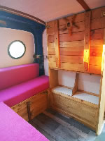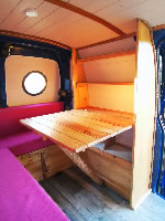 Porthole van windows in the rear barn doors, wood detailing on the ceiling and lots of waxed reclaimed wood capture the essence of a cosy house boat interior. The owners of this one have travelled extensively throughout the UK, including a Scottish road trip. They have really personalised their van adding colour and extras.